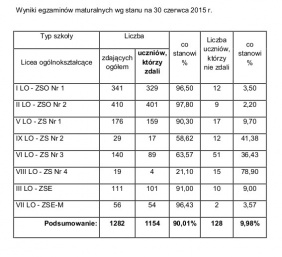 Na ogólną liczbę 1948 zdających, 1706 uczniów zdało egzamin, a 242 osoby matury nie zdało. W podziale na licea i technika nie zdało egzaminu maturalnego: 10% w liceach ogólnokształcących (128 osób) i 17% w technikach (114 uczniów).