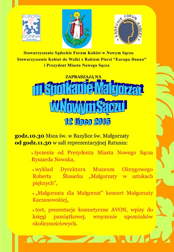 Prezydent Miasta Nowego Sącza Ryszard Nowak zaprasza na III Spotkanie Małgorzat, które odbędzie się 12 lipca 2015r. III Spotkanie Małgorzat odbywa się z inicjatywy Sądeckiego Forum Kobiet i Stowarzyszenia Kobiet do Walki z Rakiem Piersi Europa Donna i towarzyszy odbywającemu się w tych dniach Jarmarkowi św. Małgorzaty, cyklicznej imprezy organizowanej przez Muzeum Okręgowe w Nowym Sączu.