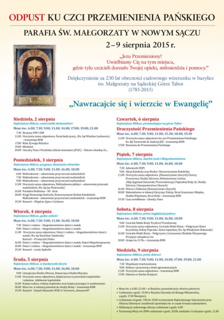 Kulminacyjnym punktem odpustu na sadeckiej górze Tabor będzie 6 sierpnia - uroczystość Przemienienia Pańskiego. Sumę odpustową będzie celebrował ordynariusz tarnowski bp Andrzej Jeż.