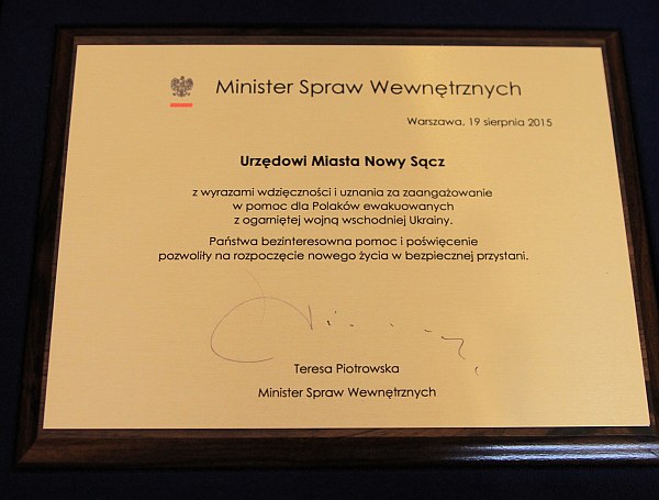 Prezydent Ryszard Nowak otrzymał podziękowania za zaangażowanie w pomoc dla Polaków ewakuowanych z ogarniętej wojną wschodniej Ukrainy. Okolicznościowy grawerton wraz ze słowami uznania za bezinteresowną pomoc i zaangażowanie w to przedsięwzięcie przekazała Minister Spraw Wewnętrznych Terasa Piotrowska, podczas spotkania podsumowującego działalność programu adaptacyjnego dla osób polskiego pochodzenia ewakuowanych z Donbasu, który został zrealizowany na terenie Rzeczypospolitej Polskiej.