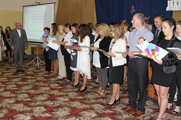 - Przed chwilą złożyliście ślubowanie. Wypowiedzieliście ważne słowa, w których zawiera się to co najistotniejsze w procesie edukacji i wychowania dzieci i młodzieży. Składając ślubowanie zobowiązaliście się do wypełniania swoich obowiązków. Chciałbym, abyście swoją pracę wykonywali jak najlepiej. Życzę dobrych wyników i wiele satysfakcji z pracy, która jest nie tylko pracą, ale i powołaniem – powiedział prezydent Ryszard Nowak.