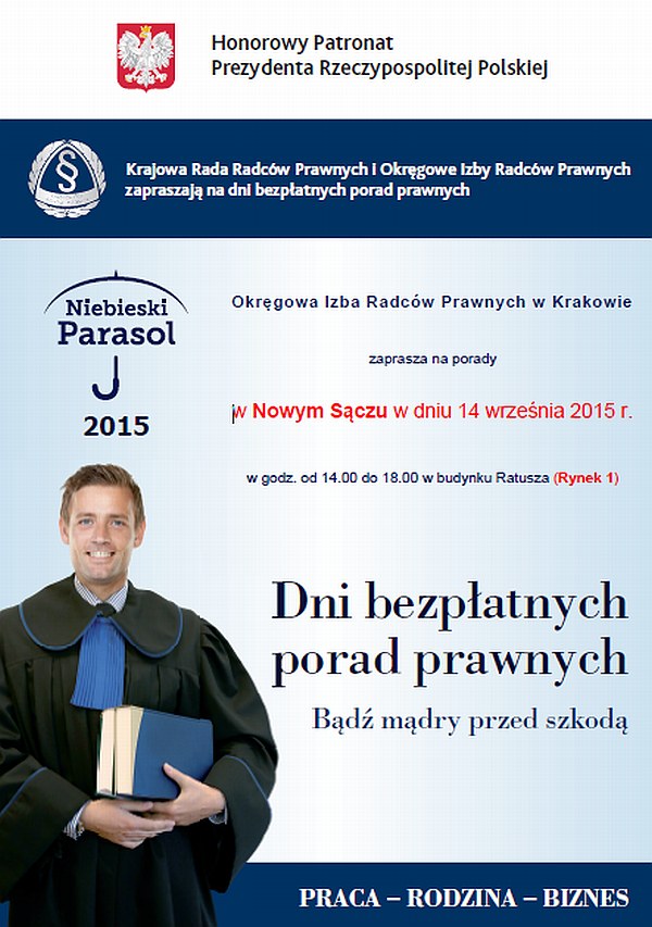 14 września 2015 roku Okręgowa Izba Radców Prawnych w Krakowie zaprasza na bezpłatne porady prawne. Prawnicy na wszystkich zainteresowanych czekać będą w Nowym Sączu, w godz. od 14.00 do 18.00 w Urzędzie Miasta, Rynek 1. Akcję bezpłatnych porad prawnych, wspiera prezydent Nowego Sącza Ryszard Nowak.