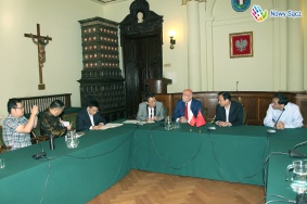 Wizyta rozpoczęła się od spotkania w sądeckim ratuszu, podczas której reprezentanci Suzhou i Nowego Sącza wymieniali swoje doświadczenia z obszaru szeroko pojętej kultury oraz polityki informacyjnej i medialnej. Wiceprezydent Jerzy Gwiżdż podkreślił jak ważne dla Nowego Sącza są dotychczasowe bardzo dobre relacje z miastem Suzhou, wyrażając nadzieję, że ich dalsza kontynuacja z pewnością wpłynie na realizację wspólnych przedsięwzięć. Obie strony potwierdziły starania o podpisanie umowy partnerskiej między miastami.