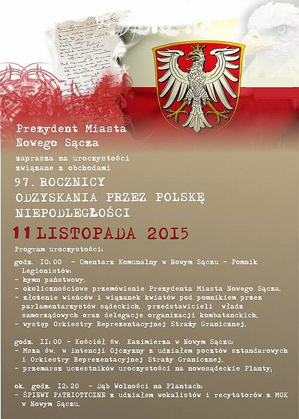 O godz. 11.00 w kościele św. Kazimierza odprawiona zostanie uroczysta msza święta w intencji Ojczyzny. Po nabożeństwie, około godz. 12.20 na sądeckich Plantach odbędzie się patriotyczne śpiewanie z udziałem recytatorów i wokalistów Miejskiego Ośrodka Kultury.