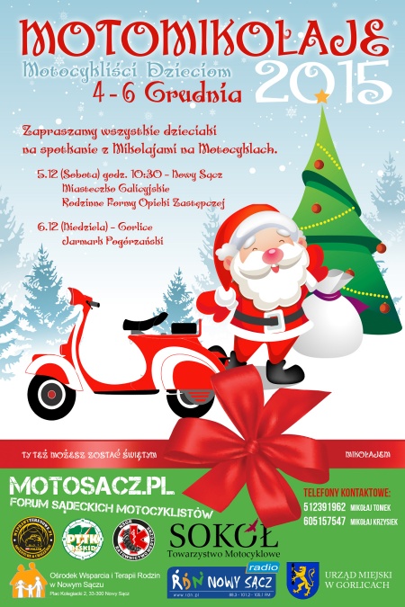 5 grudnia o godz. 10:30 w Miasteczku Galicyjskim odbędzie się spotkanie ze św. Mikołajem dla dzieci z rodzinnych form opieki zastępczej z terenu miasta Nowego Sącza. Niespodzianki i prezenty przygotowało Forum Sądeckich Motocyklistów wraz ze sponsorami i ludźmi dobrej woli. Wszystko po to, aby na twarzach najbardziej potrzebujących dzieci pojawił się prawdziwy uśmiech. Do corocznej akcji włączyli się m.in. Ośrodek Wsparcia i Terapii Rodzin w Nowym Sączu, a także Towarzystwo Motocyklowe "Sokół".