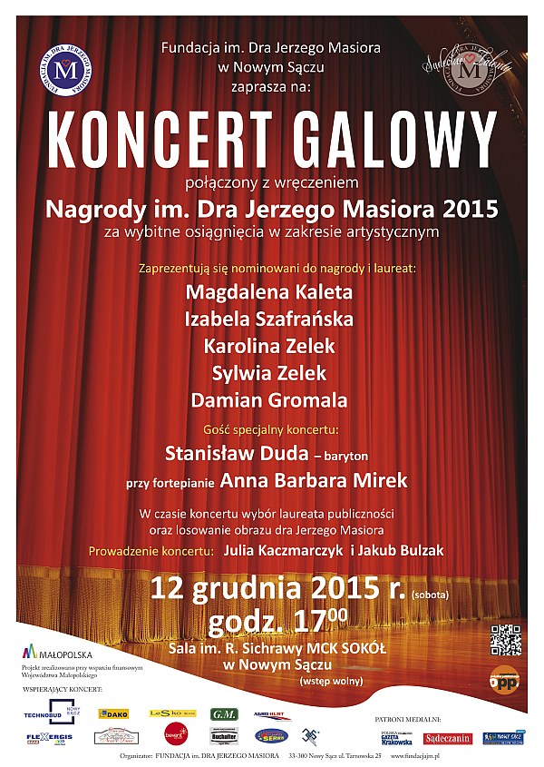 12 grudnia po raz kolejny wręczona będzie Nagroda im. Dra Jerzego Masiora za wybitne osiągnięcia w zakresie artystycznym w 2015 r. Fundacja w ten sposób honoruje osoby młode (do 25 lat) posiadające szczególny talent, a ich sukcesy pozytywnie wpływają na rozwój i promocję miasta Nowego Sącza i regionu.