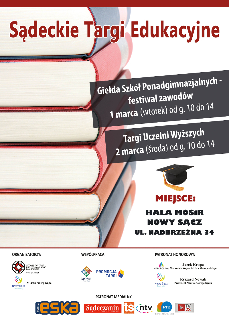 W środę (2 marca) w Nowym Sączu w godzinach od 10:00 do 14:00 w hali Miejskiego Ośrodka Sportu i Rekreacji przy ul. Nadbrzeżnej odbędzie się kolejna edycja Sądeckich Targów Uczelni Wyższych. Wydarzenie to jest częścią odbywających się w dniach 1-2 marca Sądeckich Targów Edukacyjnych, które 1 marca otwiera Giełda Szkół Ponadgimnazjalnych. Honorowy patronat nad tym wydarzeniem objął Prezydent Miasta Nowego Sącza Ryszard Nowak.