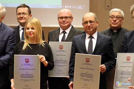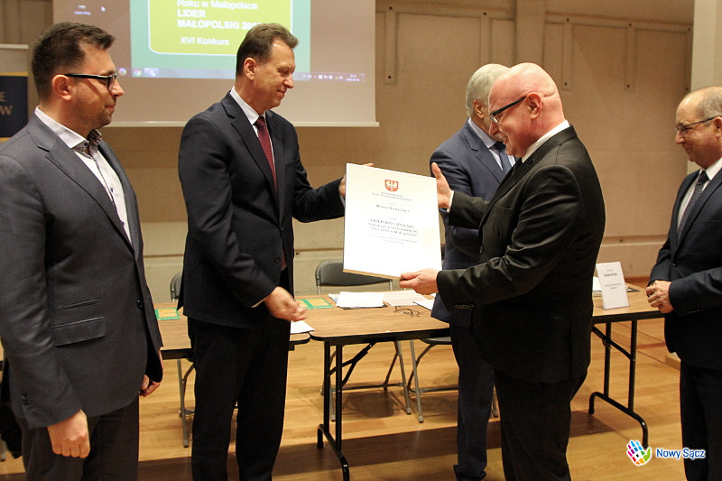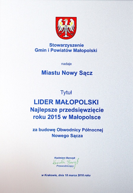 Prezydent Ryszard Nowak odebrał dzisiaj wyróżnienie za budowę Obwodnicy Północnej z nowym mostem na Dunajcu w ramach, organizowanego przez Stowarzyszenie Gmin i Powiatów Małopolski, Konkursu "Najlepsze Przedsięwzięcie Roku 2015 w Małopolsce - LIDER MAŁOPOLSKI". Gratulacje Prezydentowi Nowego Sącza złożyli: Wiceminister Skarbu Państwa Filip Grzegorczyk, Marszałek Województwa Małopolskiego Jacek Krupa, rektor Uniwersytetu Jagiellońskiego prof. dr hab. med. Wojciech Nowak oraz przewodniczący Stowarzyszenia Gmin i Powiatów Małopolski Kazimierz Barczyk. W spotkaniu wziął również udział ks. Jan Kabziński, prezes Centrum Jana Pawła II, gdzie odbyło się podsumowanie Konkursu.