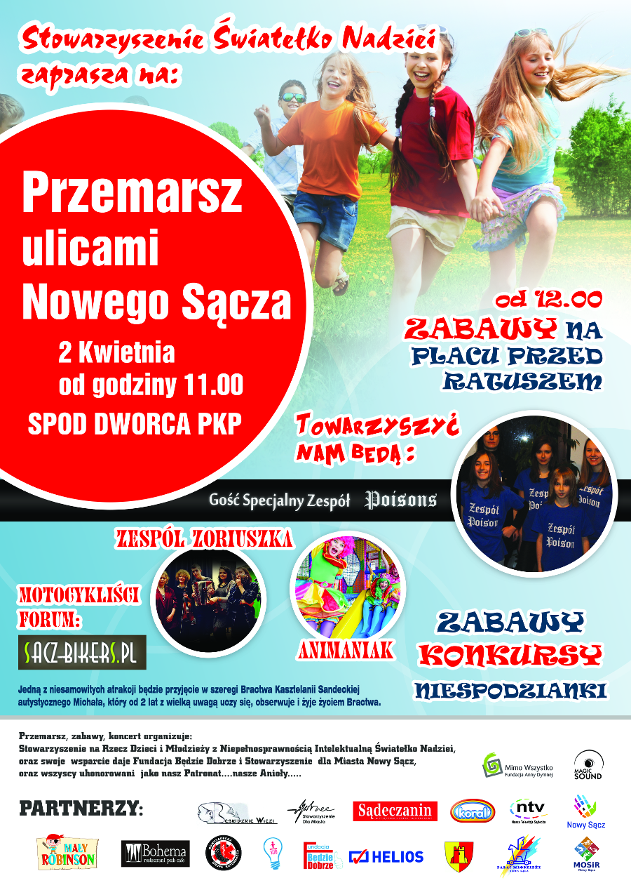 W sobotę 2 kwietnia, pod patronatem prezydenta Ryszarda Nowaka, ulicami Nowego Sącza przejdzie przemarsz w ramach Światowego Dnia Autyzmu. Jego uczestnicy wyruszą o godz. 11:00 spod dworca PKP i przejdą na płytę sądeckiego Rynku, gdzie około godz. 12:00 rozpoczną się zabawy i konkursy dla dzieci z udziałem zaproszonych gości.