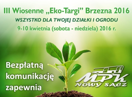 W najbliższy weekend (9-10 kwietnia), pod hasłem "Wszystko dla twojej działki i ogrodu", odbędą się III Wiosenne "Eko-Targi" Brzezna 2016. Bezpłatny dojazd na teren organizowanych Targów zapewnia Miejskie Przedsiębiorstwo Komunikacyjne w Nowym Sączu. Zachęcamy do zapoznania się z rozkładem jazdy.