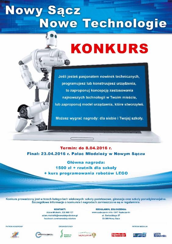 Już w najbliższą sobotę 23 kwietnia o godzinie 13:00 w Pałacu Młodzieży w Nowym Sączu ogłoszony zostanie zwycięzca konkursu "Nowy Sącz, Nowe Technologie". Jest to pierwsza edycja konkursu organizowanego przez firmę "Warsztaty Robotów – Nowoczesny Wymiar Edukacji", Towarzystwo "Sądeczanin" oraz Fundację Sądecką, przy wsparciu Pałacu Młodzieży, który objął projekt honorowym patronatem.