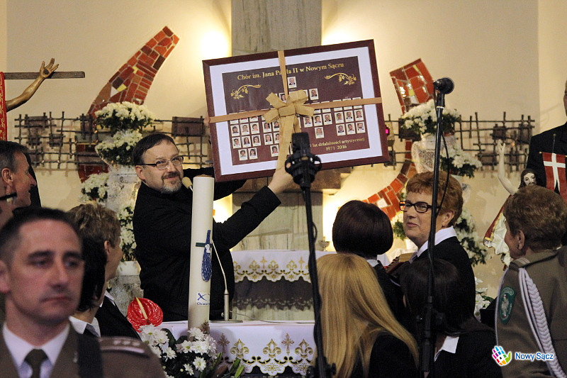 Życzenia od prezydenta Ryszarda Nowaka i Tarcza Herbowa "Zasłużony dla Miasta Nowego Sącza" od Rady Miasta Nowego Sącza - tak podczas Jubileuszu 45-lecia działalności w Kościele Najświętszego Serca Pana Jezusa uhonorowany został Chór im. Jana Pawła II, a także jego założyciel Stanisław Wolak. - Proszę przyjąć moje gratulacje i podziękowania za te 45 lat pracy, która przynosi satysfakcję, ale wiem, że jest też ciężką i dużo trzeba wytrwałości, poświęcenia, aby osiągać tak znakomite efekty. Ten kosz z 45 różami jest symbolem doceniania każdego roku waszej pracy, a przede wszystkim pracy Pana Stanisława Wolaka - powiedział prezydent Ryszard Nowak na zakończenie jubileuszowego koncertu.
