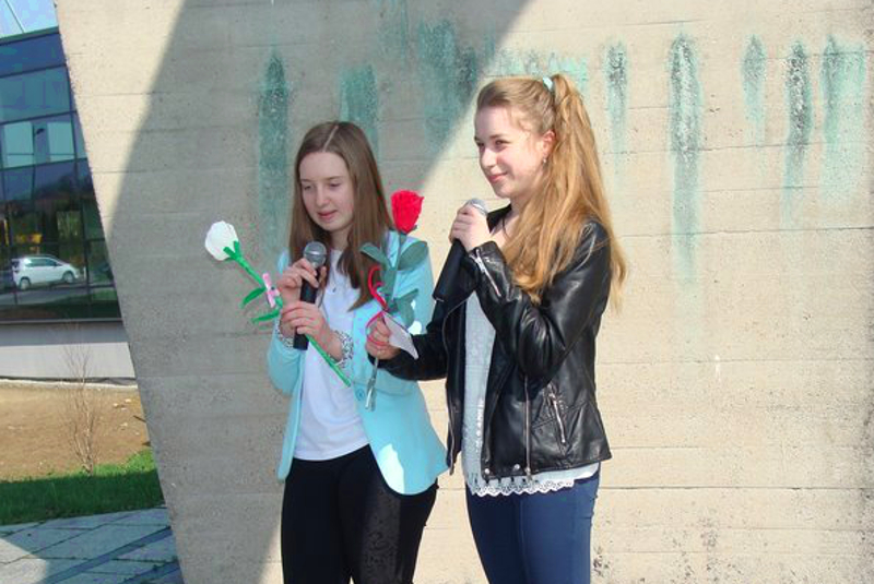 Zofia Bocheńska i Ewa Dyszkiewicz z klasy 2 "a" prowadząc sondę uliczną "Radio przyjechało "rozmawiały z przechodniami na temat znajomości historii wydarzeń związanych z MPN, jakim jest Pomnik Ofiar Faszyzmu przy ul. Krańcowej.