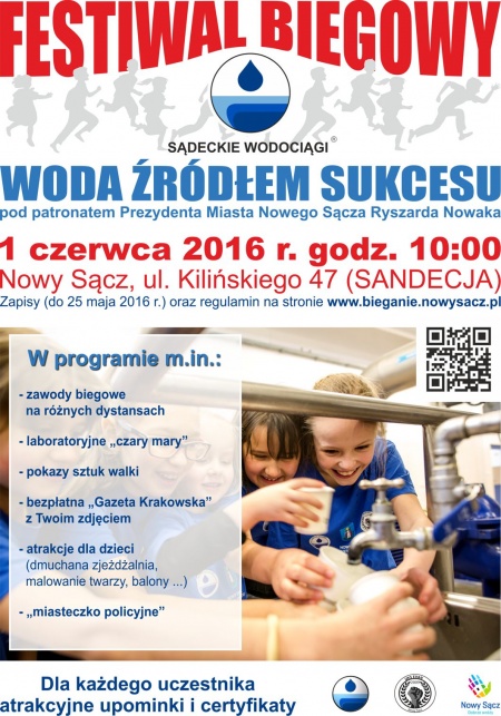 W Dzień Dziecka 1 czerwca 2016 r. o godz. 10:00 odbędzie się organizowany przez Spółkę Sądeckie Wodociągi i Uczniowski Klub Sportowy Evan Festiwal biegowy "Woda źródłem sukcesu" pod patronatem Prezydenta Miasta Nowego Sącza.