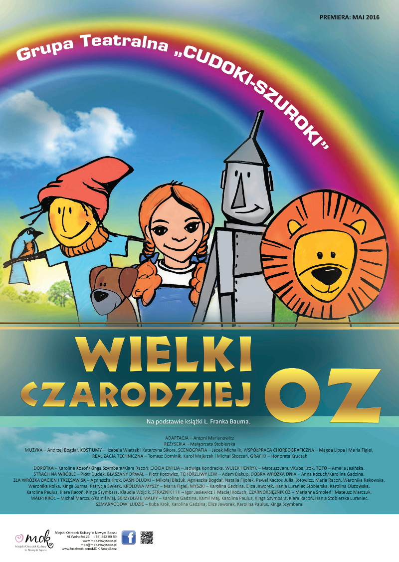 W najbliższą niedzielę - 22 maja - o godz. 17:00, w Sali Widowiskowej MOK w Nowym Sączu - Al. Wolności 23, odbędzie się kolejna premiera Grupy Teatralnej "CUDOKI-SZUROKI". Tym razem będzie to "WIELKI CZARODZIEJ OZ" w reżyserii Małgorzaty Stobierskiej. Dwa dni wcześniej - 20 maja, także o godz. 17:00 odbędzie się próba generalna przedstawienia z udziałem publiczności.