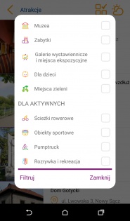2. Atrakcje – zbiór informacji o najważniejszych obiektach znajdujących się na terenie miasta Nowego Sącza. Ekran filtrujący szybko wskaże kryterium wyszukiwania: muzea, zabytki, galerie wystawiennicze, miejsca dla dzieci itp.