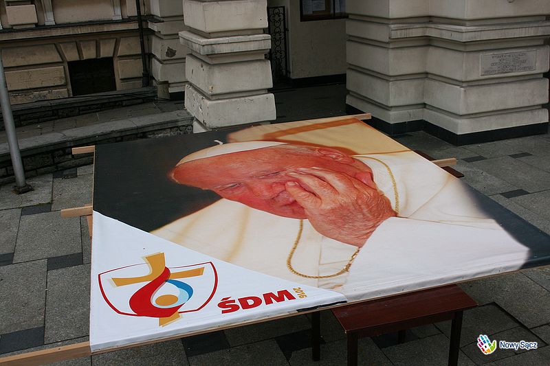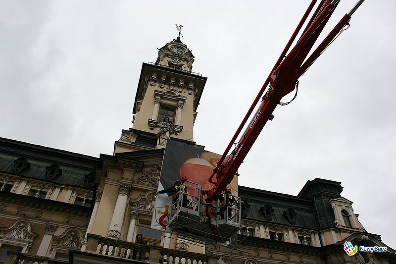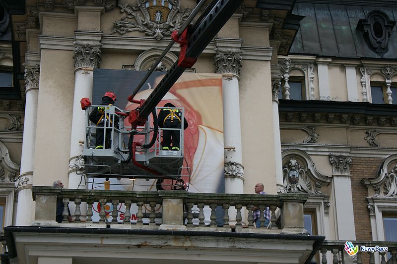 Trwają ostatnie przygotowania do Tygodnia Misyjnego w Nowym Sączu. Dzisiaj na sądeckim Rynku strażacy z Komendy Miejskiej Straży Pożarnej umieścili na wieży ratuszowej wizerunek św. Jana Pawła II, który będzie towarzyszył polskiej i francuskiej młodzieży przez cały okres trwania Światowych Dni Młodzieży w Krakowie.