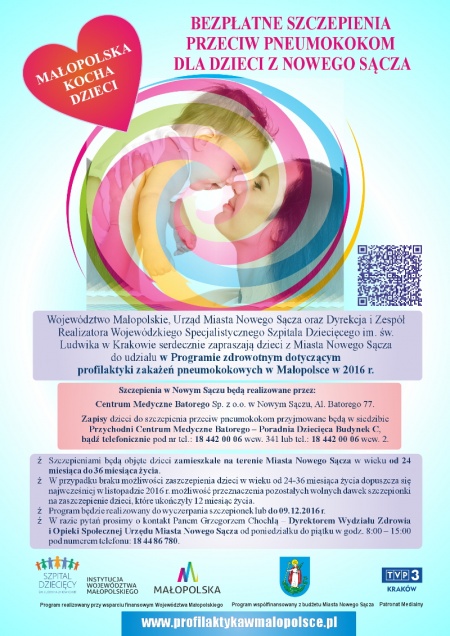 Województwo Małopolskie, Urząd Miasta Nowego Sącza oraz Dyrekcja i Zespół Realizatora Wojewódzkiego Specjalistycznego Szpitala Dziecięcego im. św. Ludwika w Krakowie serdecznie zapraszają dzieci z Miasta Nowego Sącza do udziału w Programie zdrowotnym dotyczącym profilaktyki zakażeń pneumokokowych w Małopolsce w 2016 r.