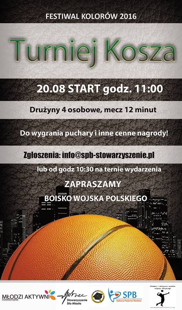 Drugi dzień Festiwalu (sobota) rozpocznie się o 15:30. Kolimacyjne wydarzenie, wyrzut kolorowych proszków, zaplanowano na godz. 16:00. Wydarzeniem towarzyszącym będzie turniej koszykówki. Zgłoszenia 4-osobowych drużyn pod adresem: info@spb-stowarzyszenie.pl lub przed turniejem od 10.30. Pełny program imprezy – poniżej.