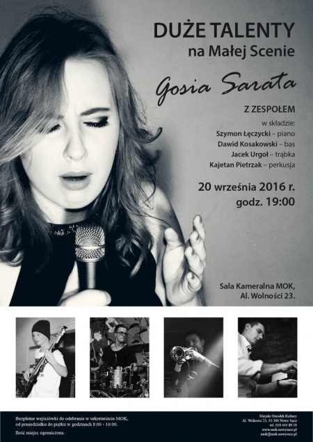 Gosia Sarata z zespołem muzycznym zainauguruje 20 września nowy cykl koncertów w Miejskim Ośrodku Kultury w Nowym Sączu. Cykl nosi tytuł "Duże talenty na małej scenie".