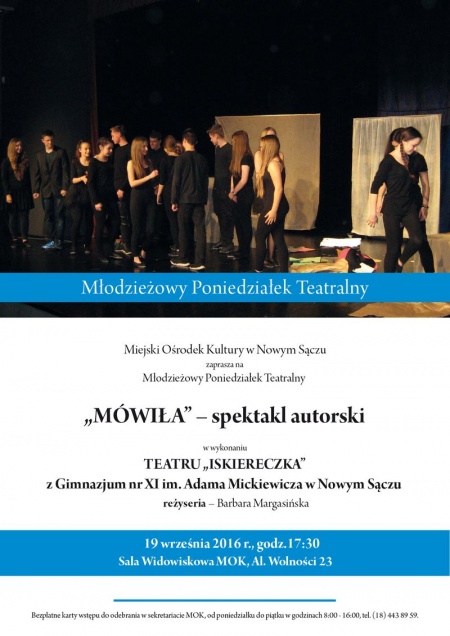 Po wakacyjnej przerwie Miejski Ośrodek Kultury w Nowym Sączu wznawia prezentacje teatrów szkolnych pod nazwą Młodzieżowe Poniedziałki Teatralne. Na pierwszy ogień idzie Teatr Iskiereczka ze spektaklem "Mówiła".