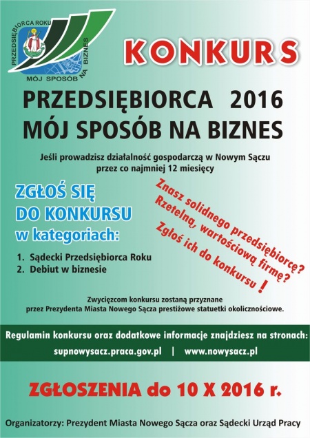 Prowadzisz działalność na terenie Nowego Sącza, a Twój biznes nieustannie się rozwija? Prowadzenie firmy to równocześnie Twoja pasja? Nie czekaj! Najpóźniej do 10 października zgłoś się do konkursu "Mój sposób na biznes" i zyskaj miano Przedsiębiorcy Roku 2016! Do konkursu można się zgłaszać osobiście lub za zgodą zostać zgłoszonym przez osoby trzecie.