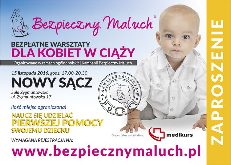 Bezpieczny Maluch jest to najszersza w Polsce akcja skierowana do kobiet w ciąży i rodziców małych dzieci mająca na celu edukację z zakresu bezpieczeństwa i zdrowego rozwoju dziecka. Misją Kampanii jest zwiększenie świadomości dotyczącej bezpiecznego macierzyństwa. Na najbliższym spotkaniu w Nowym Sączu przyszli rodzice będą mogli przećwiczyć pierwszą pomoc u niemowląt. Wezmą też udział w autorskim warsztacie dotyczącym bezpieczeństwa dziecka w podróży. W trakcie warsztatu przyszli rodzice dowiedzą się jak wybrać bezpieczny fotelik dla swojego dziecka, jak prawidłowo go zamontować w samochodzie oraz jak zapiąć dziecko w foteliku zapewniając mu maksimum bezpieczeństwa i komfortu. Każda uczestniczka spotkania dostanie podręcznik Bezpiecznego Malucha, w którym znajdzie schematy postępowania w przypadku nieszczęśliwych zdarzeń. Na koniec każdego spotkania można wygrać atrakcyjne nagrody.