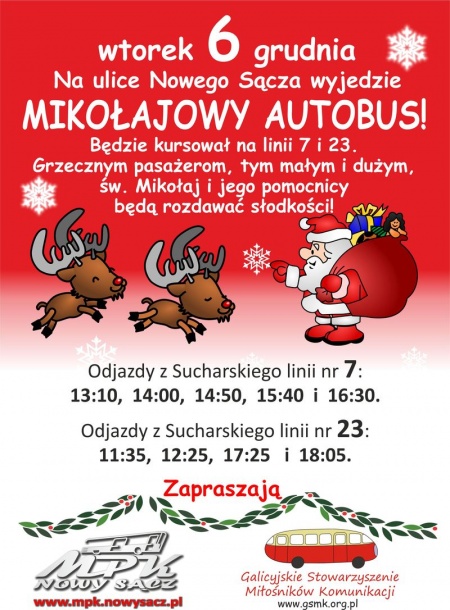 Do "Mikołajowego autobusu" zaprasza Miejskie Przedsiębiorstwo Komunikacyjne w Nowym Sączu i Galicyjskie Stowarzyszenie Miłośników Komunikacji.
