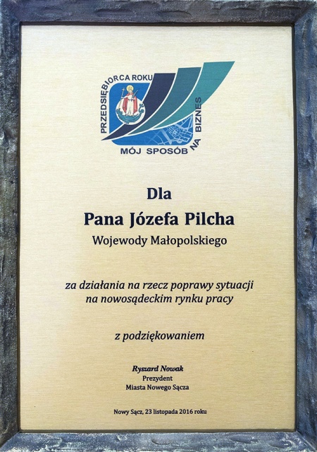 Wojewoda Małopolski otrzymał od sądeckich samorządowców specjalne podziękowanie za wspieranie obszaru aktywizacji na lokalnym rynku pracy. Józef Pilch m.in. od zawsze angażuje się we wspieranie inicjatyw mających doprowadzić do poprawy połączeń komunikacyjnych pomiędzy Krakowem a Nowym Sączem. Leszek Langer złożył również Wojewodzie Małopolskiemu życzenia z okazji zbliżających się świąt Bożego Narodzenia.