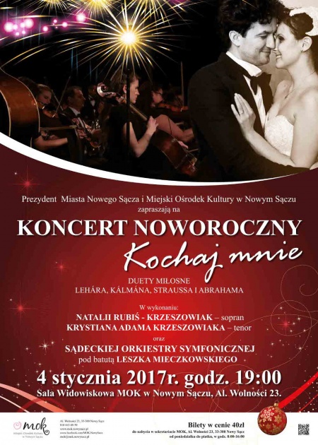 Prezydent Miasta Nowego Sącza i Miejski Ośrodek Kultury zapraszają na tradycyjny koncert noworoczny pt. "Kochaj mnie", który odbędzie się 4 stycznia 2017 r. (środa) o godz. 19:00 w sali widowiskowej MOK (Al. Wolności 23).