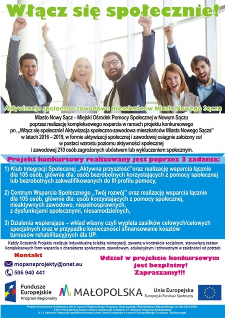 "Włącz się społecznie! Aktywizacja społeczno-zawodowa mieszkańców Miasta Nowego Sącza" to nowy projekt realizowany przez Miejski Ośrodek Pomocy Społecznej w Nowym Sączu ze środków Regionalnego Programu Operacyjnego Województwa Małopolskiego na lata 2014-2020. Wsparcie otrzyma 210 osób w najtrudniejszej sytuacji zawodowej i społecznej.
