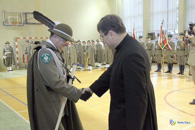 Komendant Mieczysław Kurek podkreślił, że wszyscy, którzy pełnili swoje obowiązki w Karpackim Ośrodku Wsparcia Straży Granicznej znaleźli również swoje miejsce i nowe obowiązki w działającym obecnie Karpackim Oddziale Straży Granicznej w Nowym Sączu. - Życzę abyście nadal z całym sercem i zaangażowaniem podchodzili do swoich obowiązków, nie oglądając się do tyłu, tylko patrząc przed siebie. Jeszcze raz serdecznie dziękuję! - zaznaczył kończący swoją funkcję płk Mieczysław Kurek, który zwrócił się również z podziękowaniem za duchowe wsparcie i modlitwę podczas wspólnie organizowanych uroczystości kościelnych i państwowych do Prepozyta Kapituły Kolegiackiej ks. dr Jerzego Jurkiewicza. Płk Kurek wręczył proboszczowi Parafii św. Małgorzaty symboliczną góralską ciupagę.