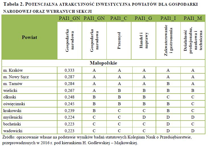 Wskaźniki potencjalnej atrakcyjności inwestycyjnej w wersji podstawowej (PAI1) odnoszą się do całości gospodarki narodowej oraz do poszczególnych wybranych sekcji stanowiących trzon gospodarki narodowej: C – przemysłu przetwórczego, G – handlu i napraw, I – zakwaterowania i gastronomii, M – działalności profesjonalnej, naukowej i technicznej. W raporcie "Atrakcyjność inwestycyjna regionów 2016" Małopolska znalazła się w czołówce najbardziej atrakcyjnych dla inwestorów województw, w Polsce, ustępując tylko Mazowszu oraz Górnemu i Dolnemu Śląskowi.