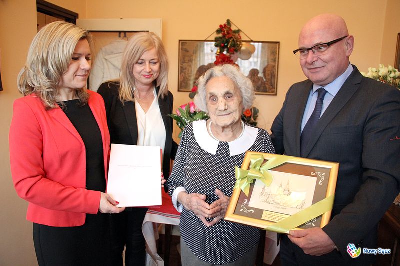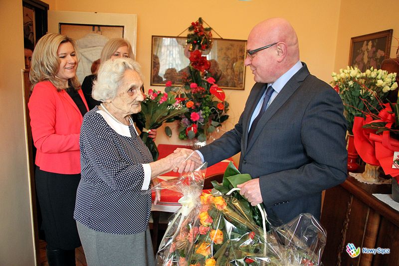 Prezydent Ryszard Nowak złożył najlepsze życzenia obchodzącej setne urodziny pani Józefie Grzegorczyk i wręczył wyjątkowej Sądeczance kosz kwiatów wraz z upominkiem oraz listy gratulacyjne od Premier RP Beaty Szydło oraz Wojewody Małopolskiego Józefa Pilcha.
