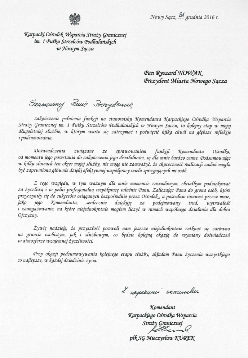 Również prezydent Ryszard Nowak podziękował Komendantowi Mieczysławowi Kurkowi, podkreślając, że był to czas dobrej współpracy, która służyła Straży Granicznej oraz miastu Nowy Sącz. - Panie Komendancie, bardzo dziękuję za pana zaangażowanie i wzorową służbę, która umożliwiała realizację wielu istotnych zadań związanych z ochroną południowej granicy państwa, ale służyła również nam, mieszkańcom Nowego Sącza. Za to wszystko bardzo dziękuję, życząc wielu sukcesów zarówno w życiu zawodowym, jak i prywatnym - zakończył prezydent.