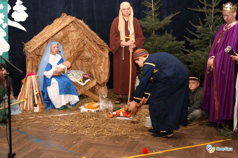 Tradycja jasełkowa jest w naszym regionie bardzo silna, stąd nie tylko duże zainteresowanie przeglądem, spodziewać się można także wysokiego poziomu artystycznego przedstawień. Miejski Ośrodek Kultury w Nowym Sączu reprezentuje Grupa Teatralna Cudoki-Szuroki z szopką dziecięcą pt. Szła kolęda w noc grudniową. [Żródło: MOK w Nowym Sączu, zdj. ilustracyjne: kadr z przedstawienia przygotowanego przez dzieci ze Szkoły Podstawowej nr 15 w Nowym Sączu].