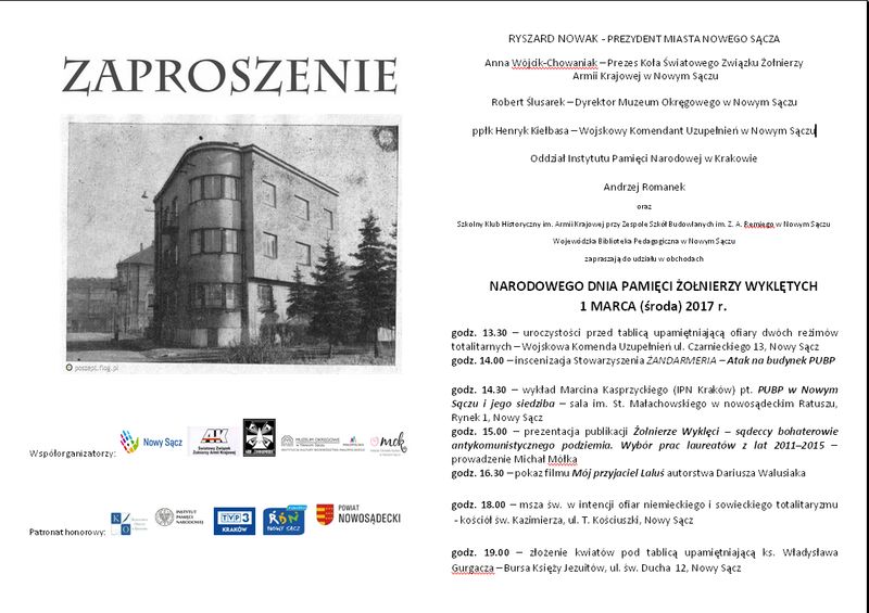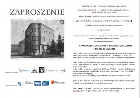 1 marca (środa) odbędą się nowosądeckie obchody Narodowego Dnia Pamięci Żołnierzy Wyklętych. W programie znajdują się między innymi inscenizacja ataku na budynek UB, film, wykład i prezentacja wydawnictwa o tematyce związanej z Żołnierzami Wyklętymi. Na obchody zapraszają organizatorzy, wśród nich prezydent Nowego Sącza Ryszard Nowak.