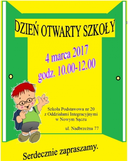 Szkoła Podstawowa nr 20 z Oddziałami Integracyjnymi w Nowym Sączu, ul. Nadbrzeżna 77, zaprasza wszystkie dzieci wraz z rodzicami na Dzień Otwarty 4 marca w godz. 10:00-12:00. Będą mogli Państwo zapoznać się z ofertą edukacyjną placówki, która dobrze uczy i bawi.