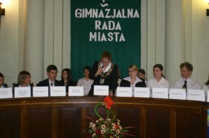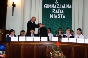 Zanim przystąpiono do debaty pod hasłem „Żyć i uczyć się w demokracji” oficjalnie doszło do przekazania insygniów władzy: złoty łańcuch przewodniczącego dorosłej Rady Miasta Jacek Chronowski przekazał przewodniczącej „gimnazjalnego parlamentu” Agnieszce Krawczuk z klasy 3 H z Gimnazjum nr 2.