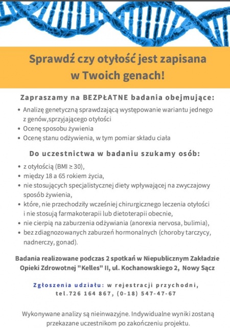 Sprawdź, czy otyłość jest zapisana w Twoich genach! Weź udział w bezpłatnym badaniu genetycznego czynnika predysponującego do występowania otyłości. Badania realizowane będą podczas dwóch spotkań w NZOZ "Kelles II" przy ul. Kochanowskiego 2.