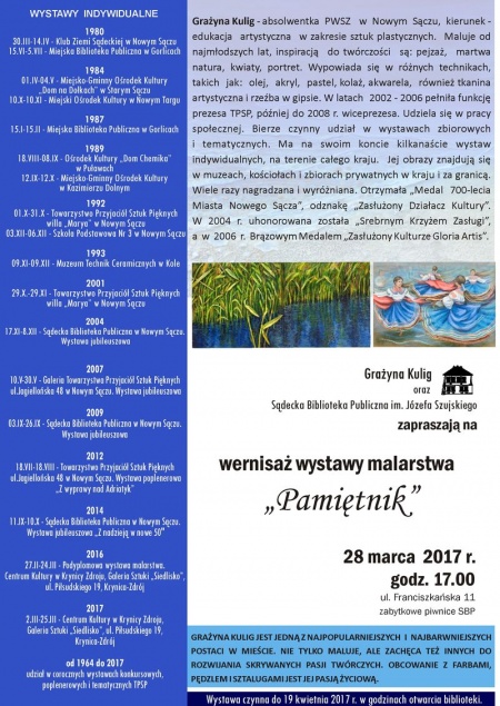 "Pamiętnik" - pod takim tytułem Grażyna Kulig wystawia swoje prace malarskie w Sądeckiej Bibliotece Publicznej im. Józefa Szujskiego. Wernisaż wystawy zbiorowej artystki odbędzie się w najbliższy wtorek (28 marca).