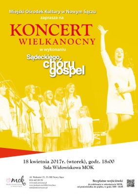18 kwietnia (wtorek) Miejski Ośrodek Kultury zaprasza miłośników muzyki gospel. W koncercie wielkanocnym wystąpi Sądecki Chór Gospel. Koncert rozpocznie się w sali widowiskowej MOK o godz. 18:00. Bezpłatne wejściówki do odebrania w sekretariacie MOK przy Al. Wolności 23 w dni robocze w godz. 8:00-16:00.