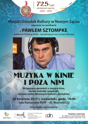 20 kwietnia (czwartek) gościem Miejskiego Ośrodka Kultury będzie znany dziennikarz muzyczny, juror festiwalu "Nowe kino – Nowy Sącz" Paweł Sztompke. Spotkanie pełne będzie opowieści i anegdot o muzyce w kinie, piosenkach i melodiach. Początek spotkania w sali kameralnej MOK o godz. 18:00. Bezpłatne wejściówki do odebrania w sekretariacie MOK w dni robocze w godz. 8:00-16:00. Liczba wejściówek ograniczona.