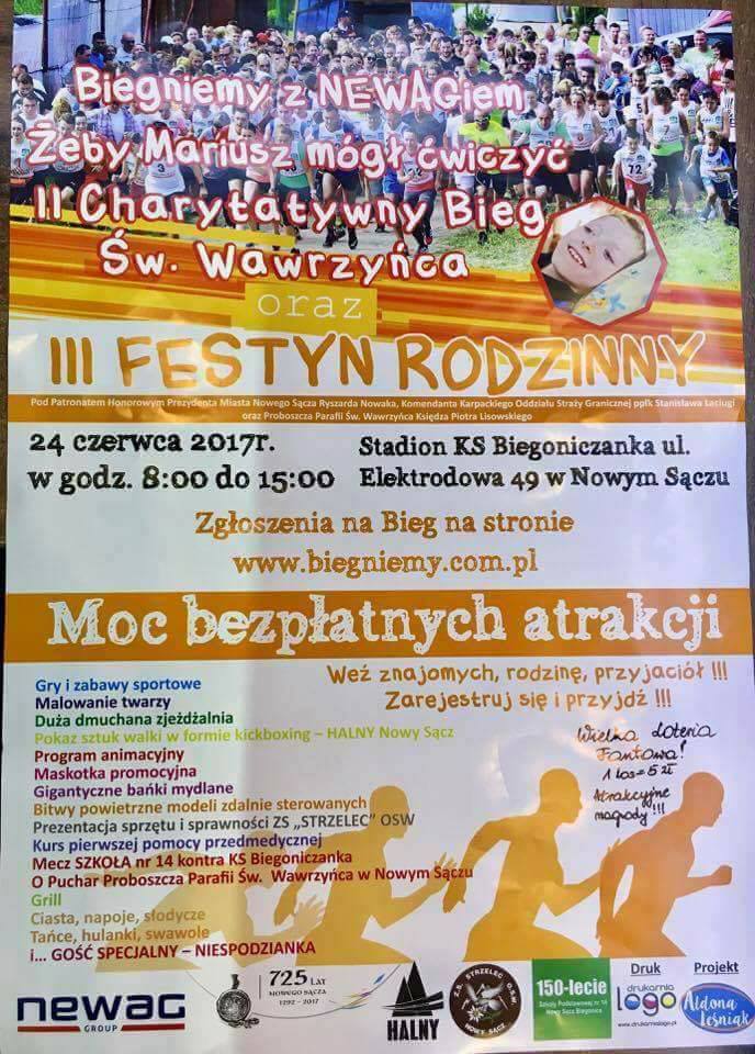 Dnia 24 czerwca na Stadionie Klubu Sportowego "Biegoniczanka" odbędzie się II Charytatywny Bieg Św. Wawrzyńca. Tak jak w tamtym roku Biegonice otworzą swoje serca dla chorego chłopca. Tym razem będzie to Mariusz Mrzyglód! Każdy, kto weźmie udział w biegu, otrzyma pamiątkowy medal!
