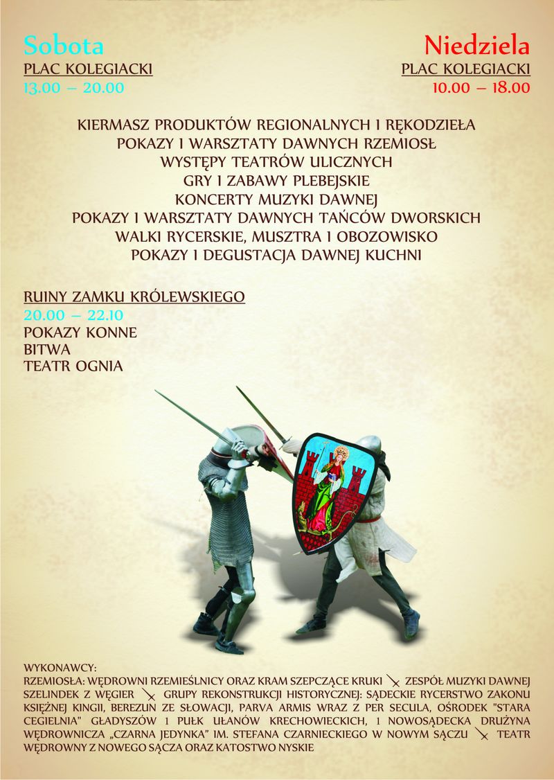 W Nowym Sączu mamy pozostałości kazimierzowskiego zamku i tam także zobaczymy interesujące widowisko. Po pokazach konnych rozegra się u stóp zamku (prawie) średniowieczna bitwa z wykorzystaniem broni białej i palnej, wierzchowców, z rycerzami w błyszczących kolczugach. Wieczór zakończy się niezwykle sugestywnym przedstawieniem teatru ognia. Impreza odbędzie się w sobotę, początek – godz. 20:00.