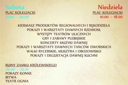 Nie zawsze było wesoło, w dawnych wiekach wojna i zwyczajne łupiestwo były na porządku dziennym. Warto przespacerować się po odtworzonym z niezwykła starannością wojskowym obozie, obejrzeć musztrę żołnierzy i walki rycerskie. A potem spróbować coś z kuchni dawnych wieków, bo przecież nasi przodkowie musieli także coś jeść. Wszystko to na Placu Kolegiackim przy Muzeum Regionalnym w sobotę od 13:00 do 20:00, a w niedzielę od 10:00 do 18:00.