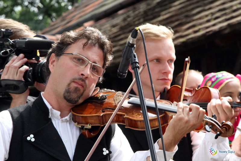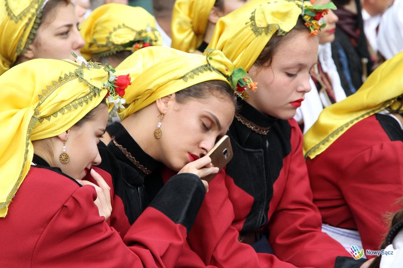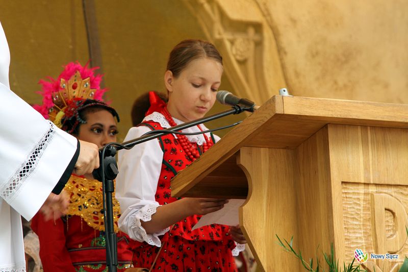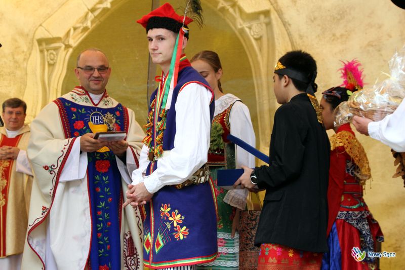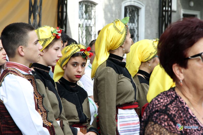 Kapelan festiwalu, ks. dr Stanisław Kowalik, nazwał bazylikę sądecką górą Tabor, gdzie spotykają się organizatorzy i uczestnicy festiwalu. – Przychodzomy do Boga, który jest ojcom syćkich dzieci na cołym świecie – mówił piękną łącką gwarą ks. Kowalik. – Ta dzisiejso ewangelia przypomino nom, ze kozdy z nos jest dzieckom Królestwa Bozego. My tutaj czerpiomy siły, moc do radości, do śpiwu, tońca i do nasych kamrackich spotkań.