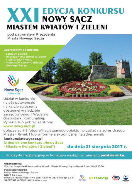 Jeszcze tylko do końca sierpnia można zgłosić udział w XXI edycji konkursu "Nowy Sącz - Miastem Kwiatów i Zieleni". Ukwieconych balkonów, ogrodów i tarasów pełnych kwiatów w naszym mieście przecież nie brakuje. Konkurs objął swoim patronatem prezydent Nowego Sącza Ryszard Nowak.
