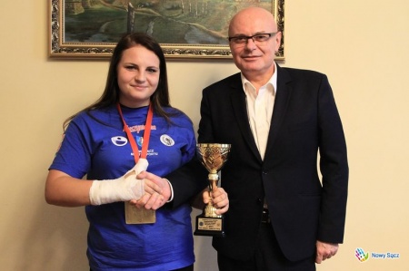 W sądeckim ratuszu odbyło się spotkanie prezydenta Ryszarda Nowaka z Jolantą Cichoń z UKS Evan oraz trenerem klubu Krzysztofem Bulandą. Sądecka zawodniczka w miniony weekend zdobyła w Skopje (Macedonia) tytuł Mistrzyni Europy w Kickboxingu juniorek w kategorii +70 kg i w formule full contact. - Serdecznie gratuluję wygranej i tytułu Mistrzyni Europy, ale dziękuję też za sportową opiekę trenerowi. To kolejny tak znaczący sukces klubu, który promuje nasze miasto, dlatego czekamy na kolejne - mówił Ryszard Nowak.