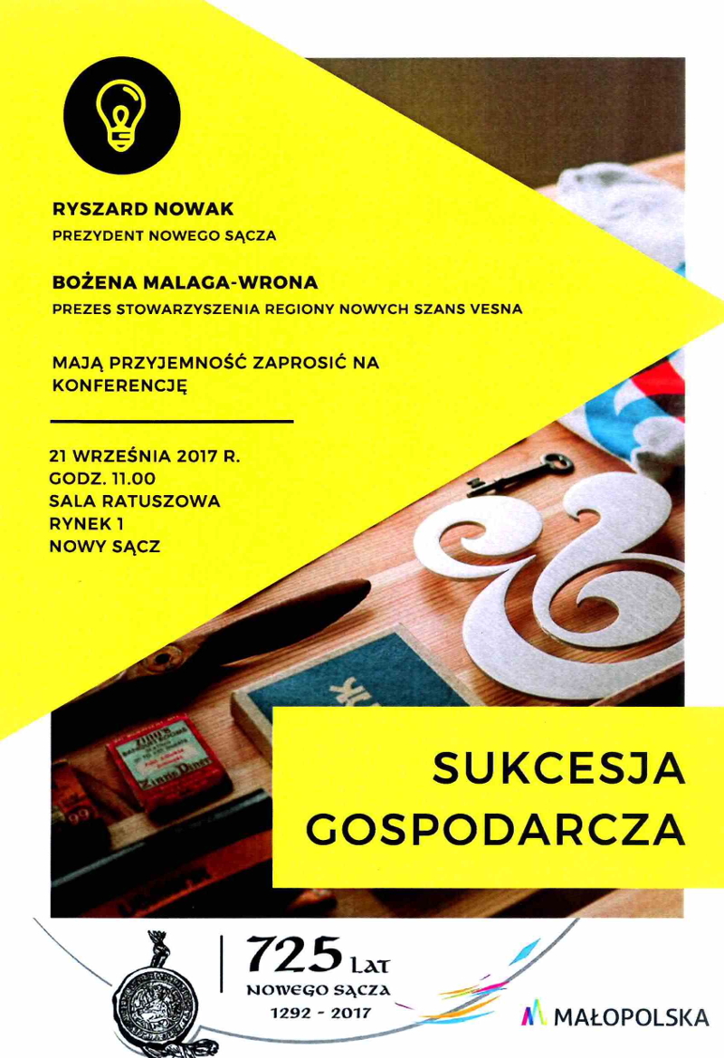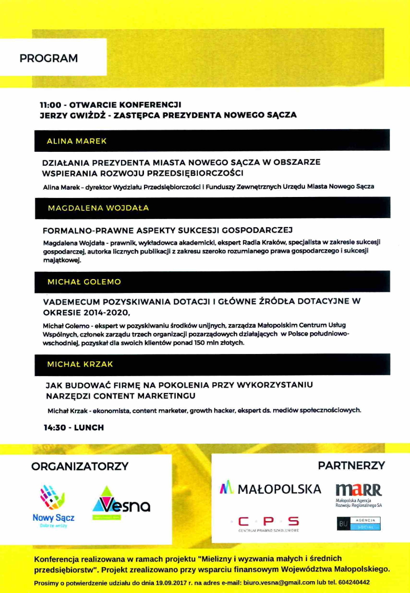 Organizatorzy konferencji Bożena Malaga-Wrona prezes Stowarzyszenia Vesna i Ryszard Nowak Prezydent Nowego Sącza zapraszają lokalnych przedsiębiorców i otoczenie biznesu do aktywnego udziału i dyskusji z ekspertami, którzy będą służyć swoją wiedzą, doświadczeniem i darmową radą. Konferencję otworzy zastępca prezydenta Jerzy Gwiżdż, który wprowadzi do dyskusji nad nowymi rozwiązaniami wspierającymi rozwój przedsiębiorczości podejmowanymi przez samorząd, o których mówić też będzie Alina Marek dyrektor Wydziału Przedsiębiorczości i Funduszy Zewnętrznych Urzędu Miasta Nowego Sącza. Zagadnienia związane z sukcesją gospodarczą oraz zagrożeniami i wyzwaniami, które stoją przed przedsiębiorcami prowadzącymi jednoosobową działalność gospodarczą przedstawi Magdalena Wojdała, prawniczka specjalizująca się w sukcesji majątkowej, wykładowca KUL i ekspert Radia Kraków. Gdzie szukać i jak skutecznie sięgać po środki finansowe na rozwój przedsiębiorstwa wyjaśni Michał Golemo ekspert w pozyskiwaniu funduszy zewnętrznych, w tym funduszy unijnych, natomiast jak budować wartość firmy na pokolenia z wykorzystaniem najnowszych trendów w komunikacji internetowej opowie Michał Krzak ekspert ds. content marketingu.